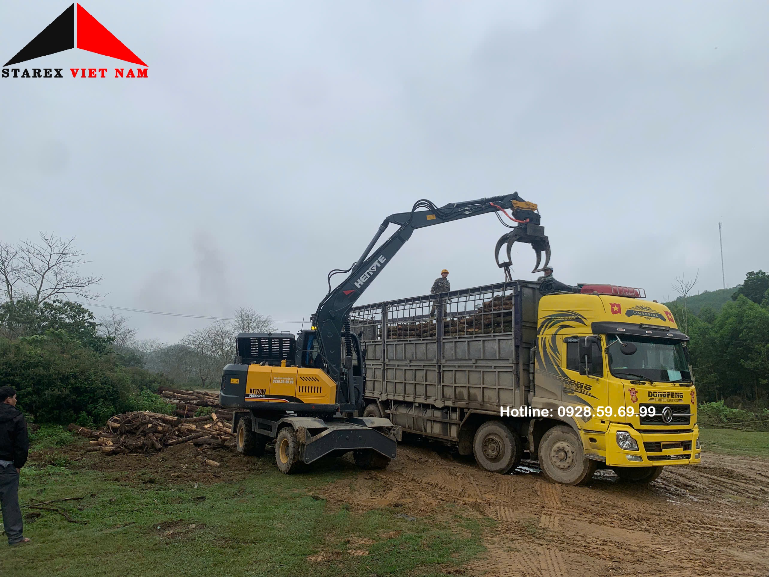 Hình ảnh thực tế máy gắp gỗ 04 HENGTE HT120W PLUS 2026 đang làm việc tại nhà máy gỗ xẻ ở Bình Định