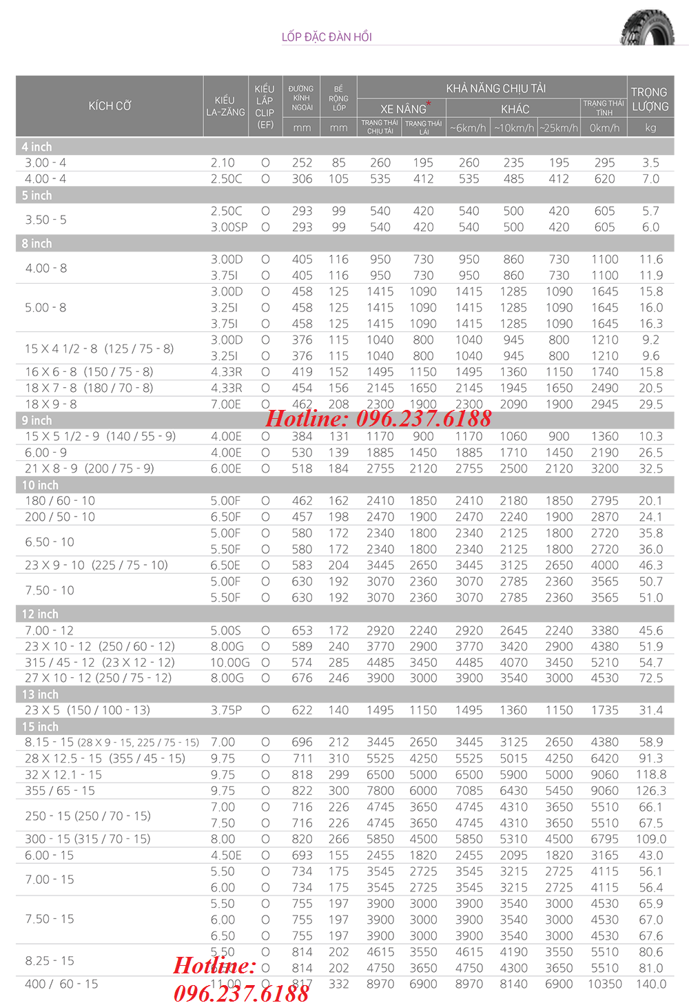 THÔNG SỐ KĨ THUẬT CÁC LOẠI LỐP XE NÂNG